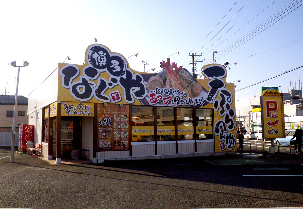 国道沿いという立地を生かして派手さを全面に押し出した看板です。お車からでもひと目でわかるよう短い言葉と写真で業態を表現、親しみを感じる店構えにすることで立ち寄りやすい雰囲気を作っています。