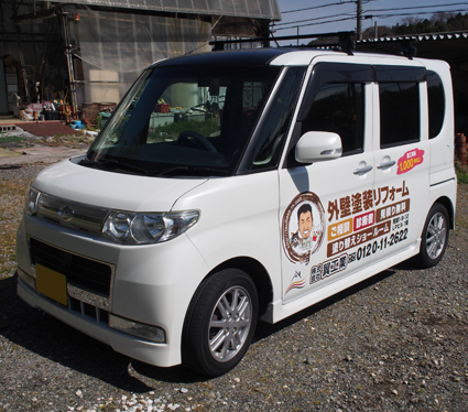 社用車の側面、背面にロゴマークを大きく配置、笑顔のイラストが会社の雰囲気をしっかりとアピール。走行中や停車中にも業務内容をお客様に伝える事が出来、目を惹きつける効果も抜群です。