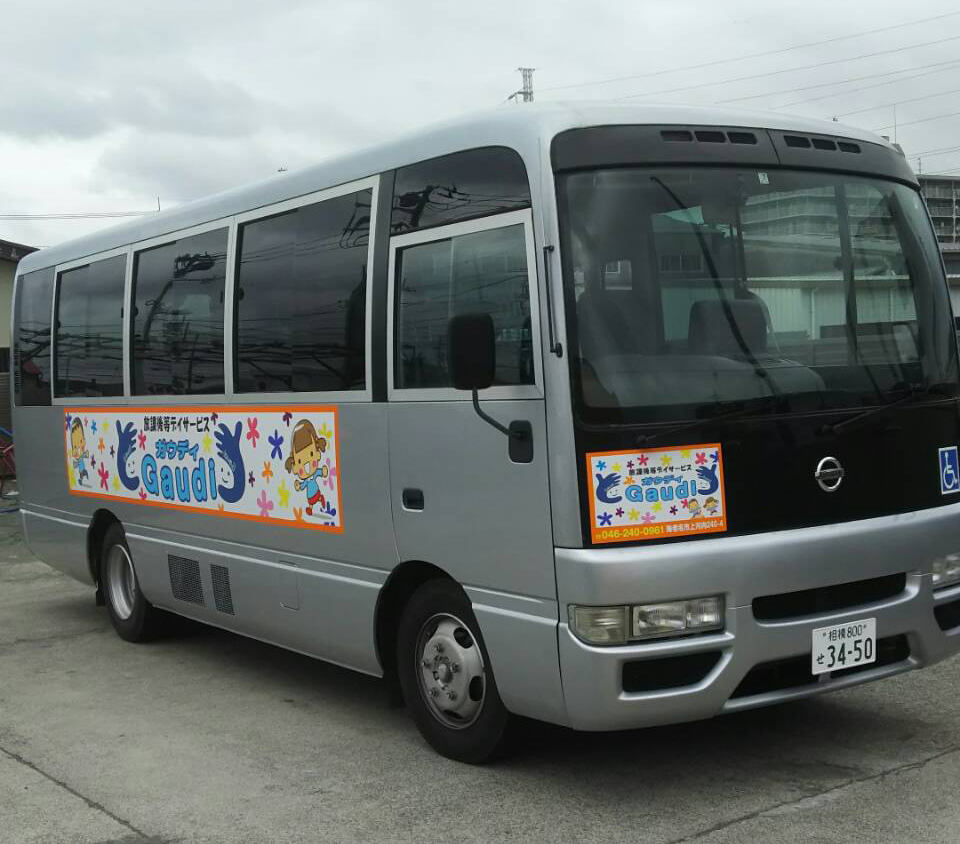 お子様たちを送迎するためのバスに明るく優しい雰囲気のシートでラッピング。元気で楽しげに駆け回るお子様をイメージしたデザインでガウディ様の雰囲気を伝える役目も果たします。